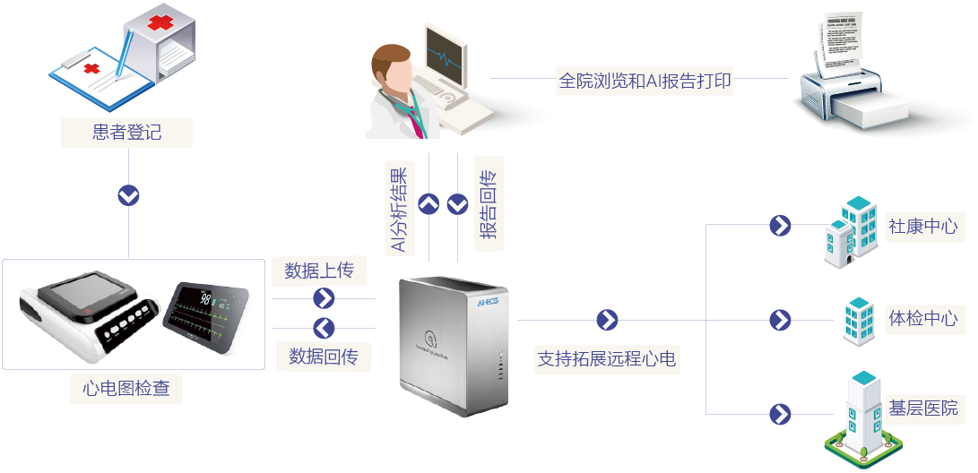 LEPU AI-ECG支持多中心数据采集、远程诊断及分级诊疗服务,可与基层医院、体检中心、社康中心等机构建立连接端口,形成一体化的技术服务链。
